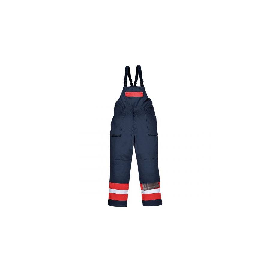 This bib and brace is constructed with high visibility reflective tape double stitched for enhanced visibility. Features include triple stitched seams, high visibility strips on the legs, two front patch pockets, one rule pocket, one front chest pocket, one back pocket with flap and stud closure and adjustable bottom leg opening.