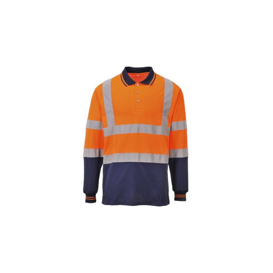 This style combines all the benefits of our best selling long sleeve polo with the additional feature of two-toning for even more practical benefit. The polyester bird eye knit material used is breathable, light, and comfortable.