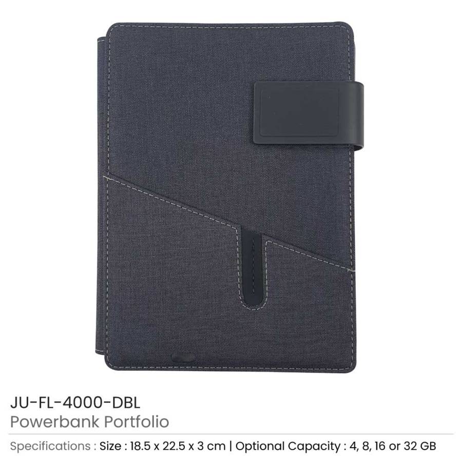 | Additional information | Notebook size powerbank portfolio with a powerbank capacity of 4000mAh, built in USB flash drive, magnetic clasp, can charge iOs & Android, elastic webbings, pen, phone and cable holder. | Size : 185 x 225 x 30mm |